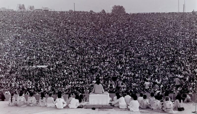 In 1969, Swami Satchidananda Saraswati attends the opening of Woodstock Music Festival.