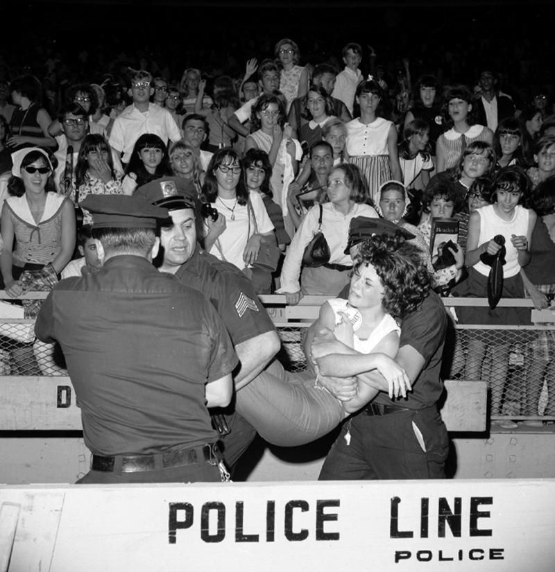 An overzealous fan is carried away by police at a Beatles concert in 1965, at Shea Stadium in New York.