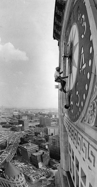 A man repaints the face of the clock on Boston's Custom House for the 1976 bicentennial celebration.